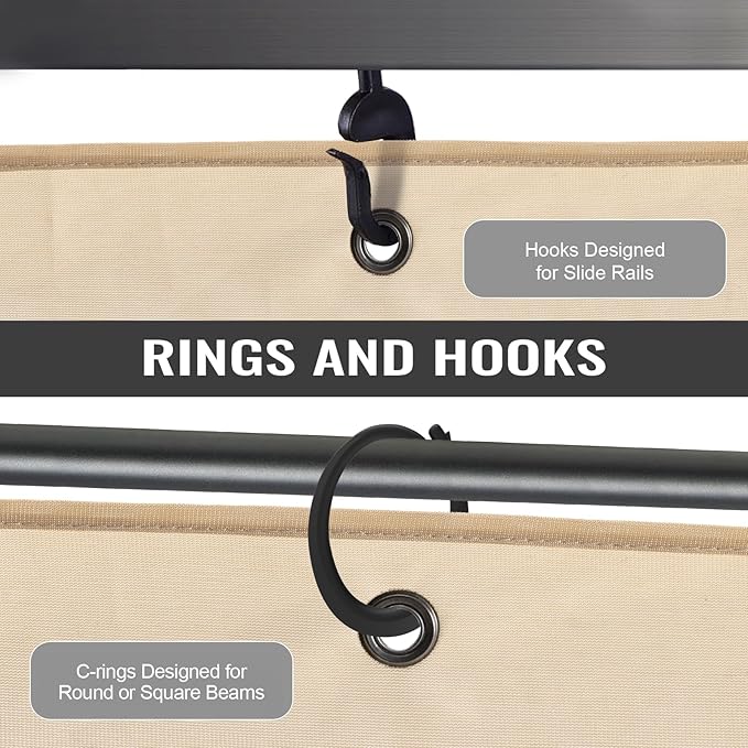 - EASY TO INSTALL: Comes with C-Rings and hooks for easy installation to meet the needs of different gazebo configurations; Hooks are for sliding rails, and the rings are for square or round tube (maximum 1-inch diameter tube)