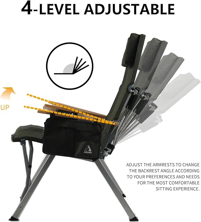 - Freely Adjustable Angle: The aruru reclining camping chair allows you to adjust the reclining angle of the backrest according to your preferences or the scene. The headrest can be adjusted in height, fitting people of various heights, and can also be used as lumbar support. This feature is very effective for those who feel discomfort or pain in the waist area. The camping chair is suitable for various scenes such as camping, living rooms, balconies, and offices, meeting different needs. You can enjoy a comfortable and personalized resting experience.