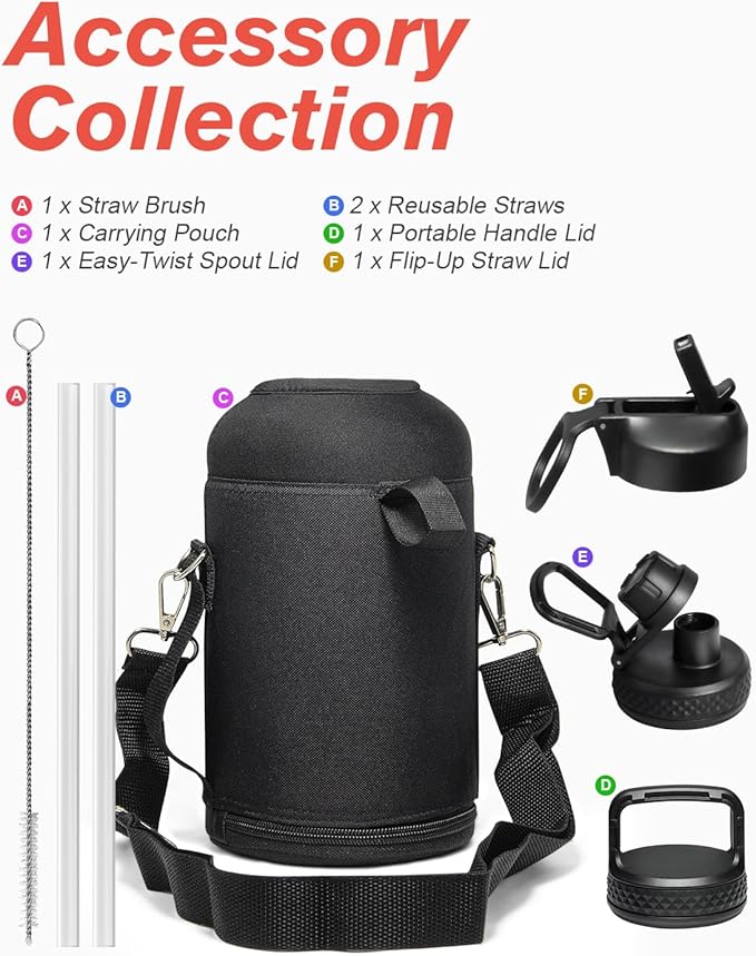 - Flexible Drinking On-the-Go: This half gallon water jug comes with 3 different lids. The screw-on lid with flip-up handle is for easy ice refilling with superior portability; spout lid makes it convenient to drink hot liquid and straw lid for sipping cold.