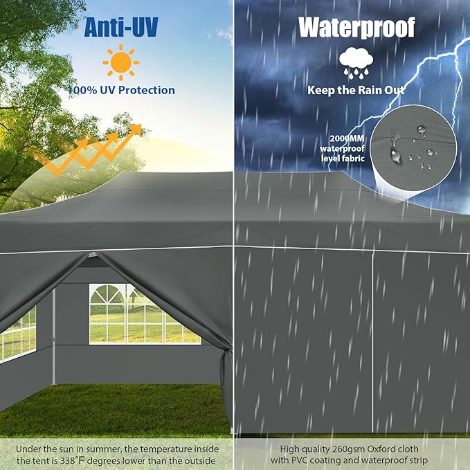 - 🏆【Upgrade 6 Removable Sidewalls】Our 10x20 commercial canopy come with 6 removable sidewalls(4 sidewalls with window+2 sidewalls with doors). 210D polyester with PU lining, which is 100% waterproof and able to block 99% UV sun rays.Elegance church windows design provide you more brightness and excellent scenery outside. Also, you could DIY the sidewalls to meet your different needs. With the help of Hook-and-loop fastener straps, sidewalls are easy to install and remove.