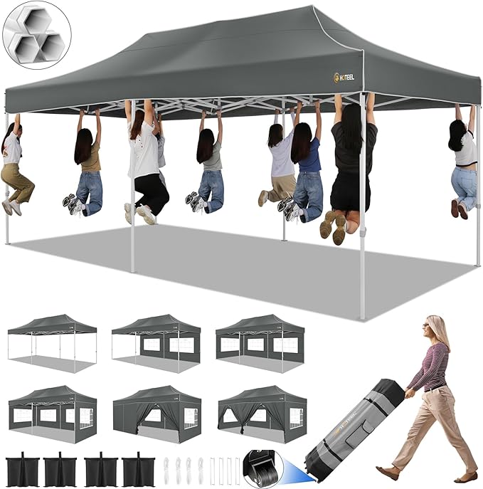 HOTEEL 10x20 Pop up Canopy Tent for Parties, Heavy Duty Easy Setup Tent with 6 Sidewalls, Outdoor Commercial Instant Gazebo for Wedding Event, with Roller Bag & Sand Bags, Grey(Hexagonal Frame)