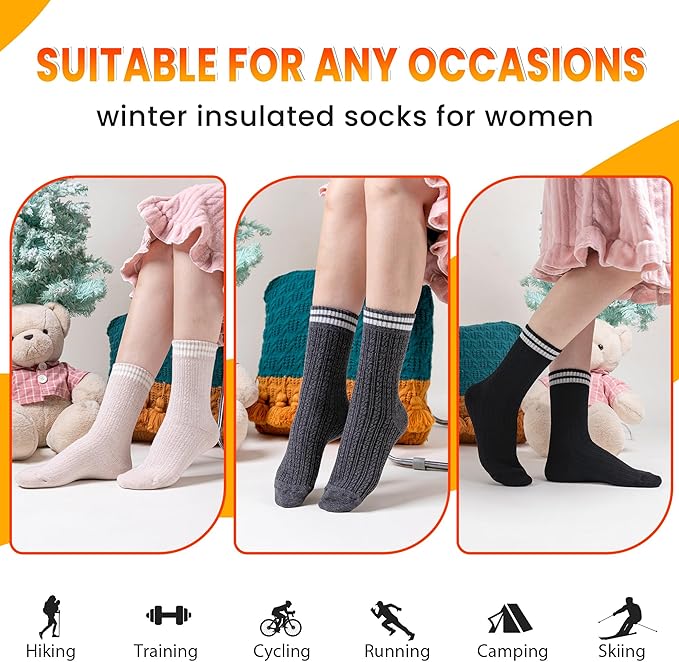 - 【Fit Many Occasions】The heated thermal socks are suitable for different situations, you can wear them as cabin socks, home floor socks, hiking socks, thermal socks, heavy work socks, winter warm socks, fuzzy socks, outdoor socks and sports socks. What's more, you can wear these thermal socks as boot christmas socks, slipper socks, home sleeping socks or daily cozy socks in winter or in any cold weather areas.