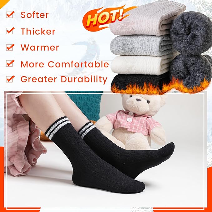 - 【Thermal Socks for Winter】Women winter warm socks are made of 82% Acrylic, 15% Polyester, 3% Spandex. The interior is lined with plush fleece that’ll hug your feet and envelop you in a cloud of fuzzy warmth.