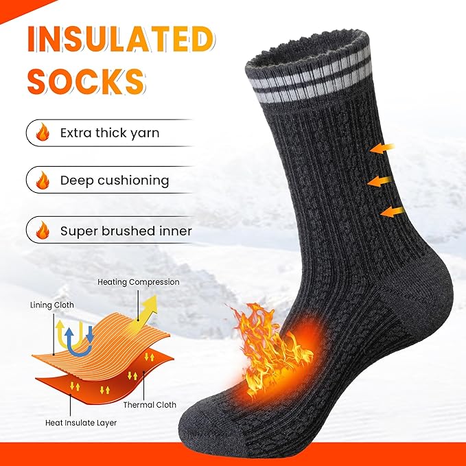- 【Thickened Construction】Extra warm for the extreme cold weather during the winter. Heavily brushed fuzzy warm lining make these insulated thermal socks provide soft and comfort for your feet during extended outdoor trail cold weather.The heated socks are ideal for you if you work outdoors, if you go skiing or if you enjoy hiking and camping in the mountains during the winter.