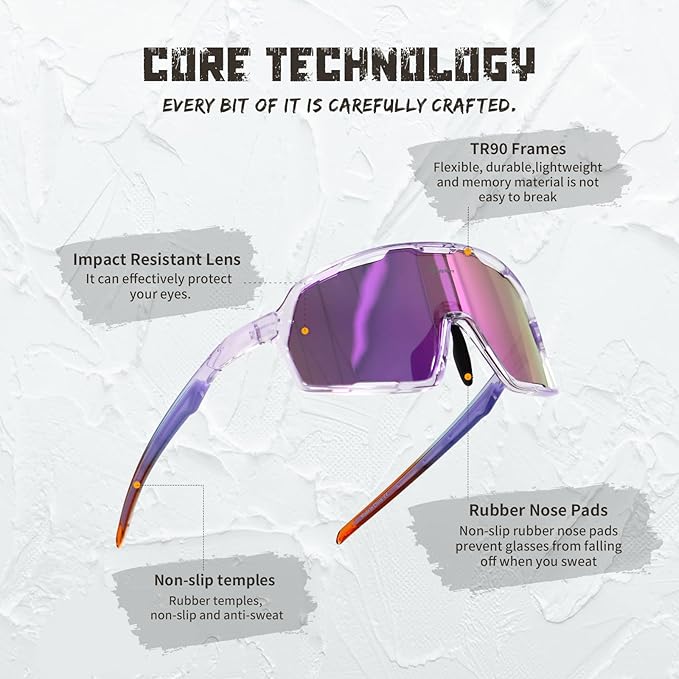 - Design: This one-piece lens design offers a broader field of vision and more visual impact. The wrap-around design and adjustable nose pads ensure a secure and comfortable fit for all face shapes. The anti-slip rubber on the temples prevents the glasses from falling off during vigorous activities