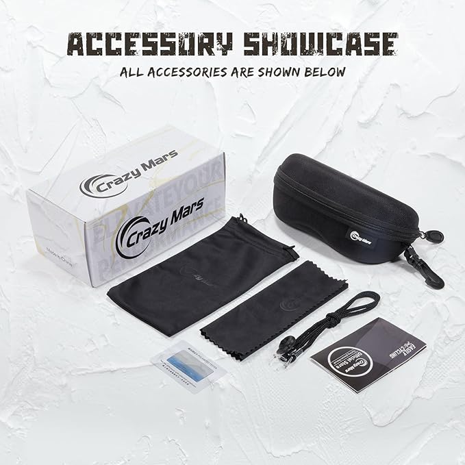 - Accessory: This product equipped with one pair of polarized glass and one interchangable PC lens, one polarized light test card, one EVA box, one gift box, one pair of myopia shelf, one glass cloth, one glass bag, one glass rope