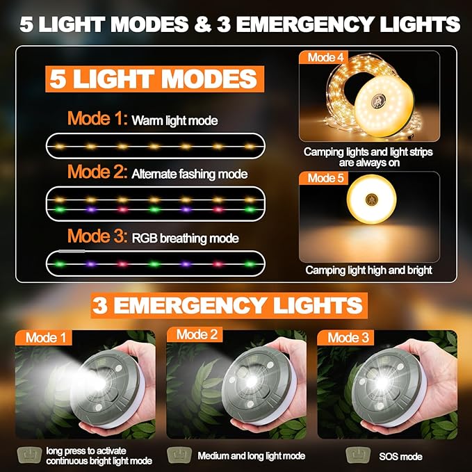- 【Multiple lighting modes】Rechargeable Tent Lights String offer 8 different modes, including constant light, breathing light and fast flashing, with 2700K color temperature. Suitable for camping, garden party, picnic or any outdoor activity that requires charming light. It is excellent for indoor and outdoor fairy lights.
