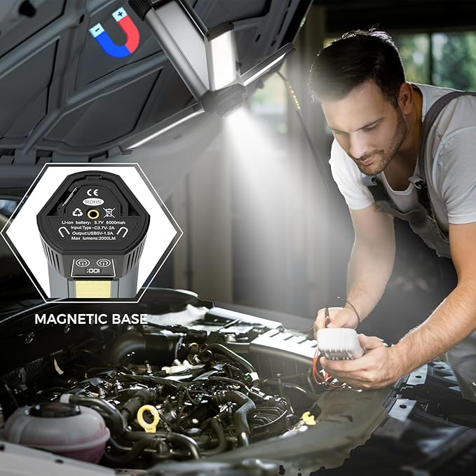 - 3 COB LAMP HEAD:Our work light with stand adopt a large 3-page lamp head design with 2000 lumens to ensure a better lighting range.Mlogiroa work lights rechargeable page can be rotated 90°vertically and 270°horizontally,which makes it more flexible and convenient to use