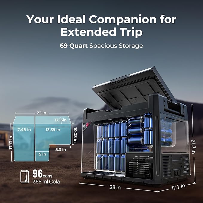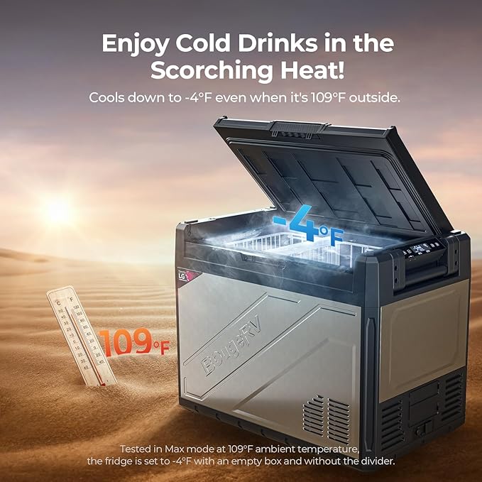 - Capable of Reaching -4℉ Even at 109℉ Ambient Temp: Using a 5.7cc compressor, the Rocky V2.0 69 quart portable refrigerator can cool down to -4℉ even in an ambient temp of 109℉, ensuring that frozen goods stays as fresh as possible even in hot environments and let you have a better outdoor experience