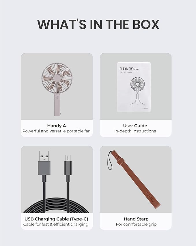 Claymore Handy A (Gray) Portable Handheld Fan - Rechargeable Foldable with Quiet BLDC Motor, USB-C Charging, 180° Adjustable Design, 6 Speed Settings, Personal Fan for Travel, Outdoor & Indoor Use