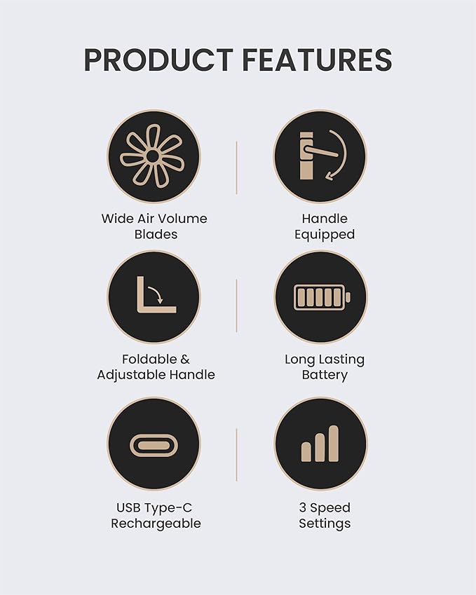 - CUSTOMIZABLE AIRFLOW & POWER BANK FEATURE: With three adjustable speeds and an ultra-gentle breeze mode, this fan adapts to your needs. It also doubles as a power bank, letting you charge your devices on the move.