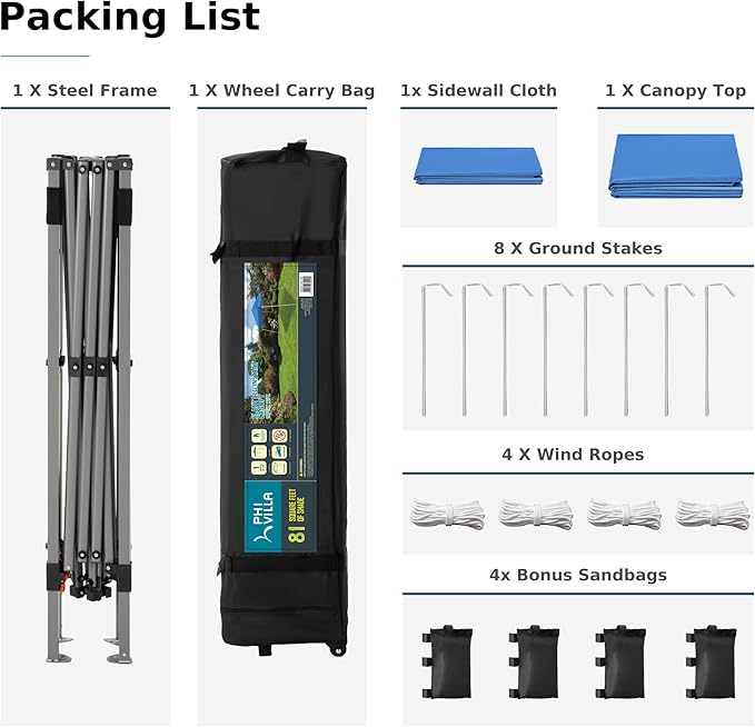- Comprehensive Accessory Kit: This pop-up canopy includes 1 wheeled carry bag, 1 Storage Bag, 4 bonus sandbags, 4 wind ropes, 8 ground stakes. This comprehensive package gives you everything you need for a stress-free and enjoyable outdoor experience