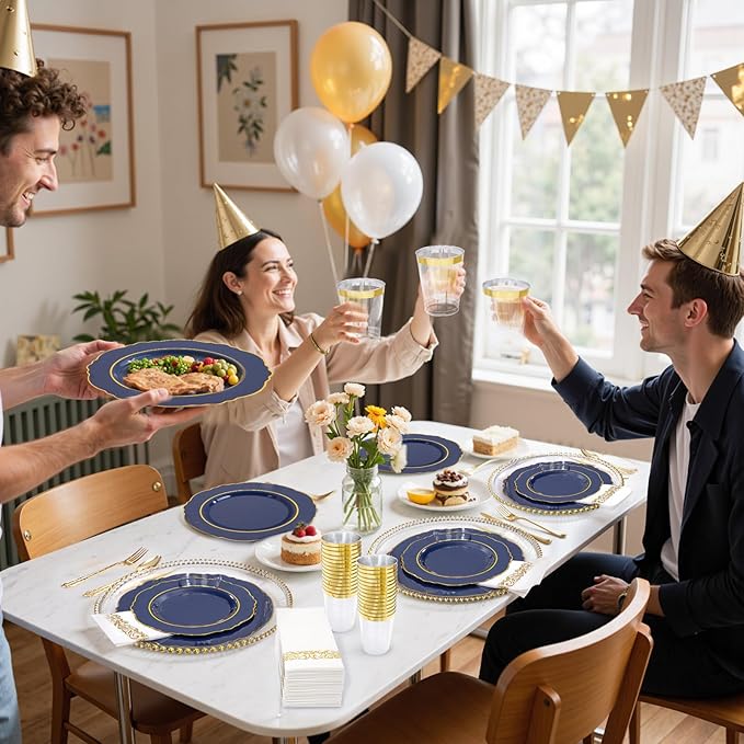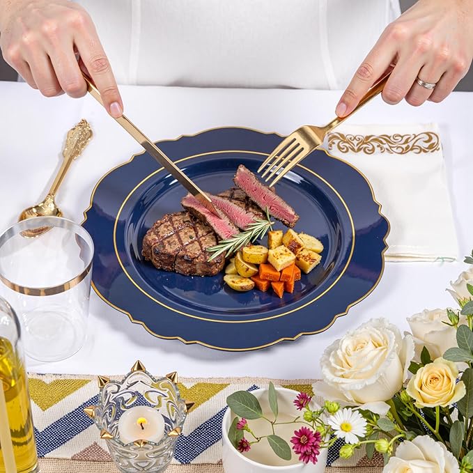 - Elevate Any Event with Quality-These navy blue and gold party plates-worthy plates boost your setup. Royal blue plastic plates and gold plastic silverware—all part of a good table display. Ideal for weddings, parties—truly top-tier navy blue plastic plates.