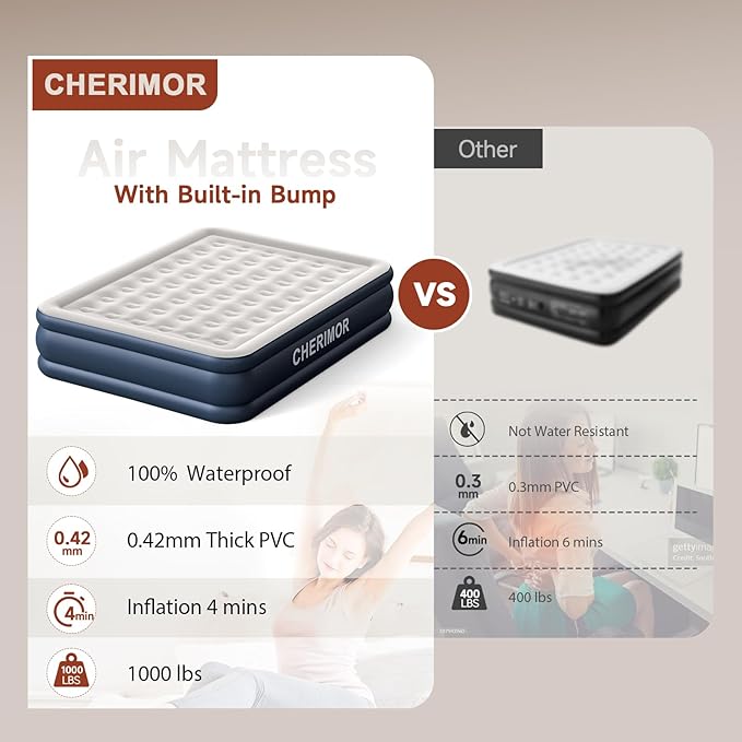 - As Comfortable as a Real Mattress: The 48 air coil beam construction evenly distributes weight, with a maximum load capacity of 1000 pounds, providing ample full-body support for an excellent night's rest. Sleeping on the CHERIMOR Inflatable Mattress feels like resting on a giant soft pillow.
