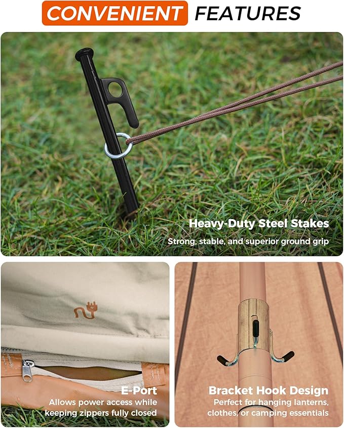 - STURDY & STABLE CONSTRUCTION – BUILT TO WITHSTAND HARSH CONDITIONS: The tent features a lightweight yet robust aluminum alloy pole system with a unique push-fit design, making setup a breeze. The structure ensures outstanding wind resistance and durability, providing reliable stability even in challenging weather, so you can camp confidently in any environment.