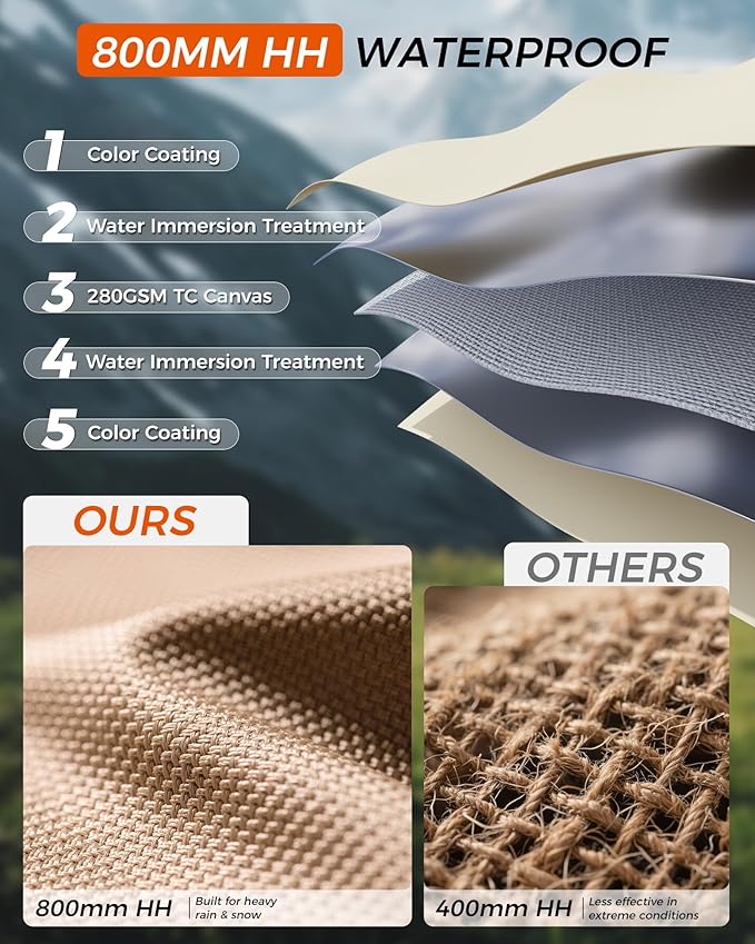 - DURABLE FABRIC & SUPERIOR WATERPROOF PROTECTION: Crafted with 340GSM TC cotton canvas, this tent combines excellent waterproofing with breathability. The 510GSM PVC flooring is abrasion-resistant and tear-proof, built to withstand rough outdoor conditions. With a triple-layer waterproof system and water-expanding thread in the stitching, the tent seals any gaps when wet, ensuring you stay dry in all weather conditions.