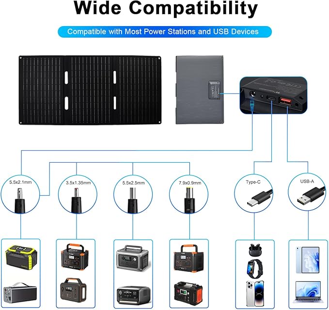 - 【Multi-Port & Wide Compatibility】Our 30w solar panel charger is equipped with 1x DC5521 cable and 3x DC connector(DC5525/DC7909/DC35135), ensuring compatibility with most of small power stations on the market. In addition, the solar charger is also designed with QC3.0 USB-A and USB-C port, which can fast charge your phones, power banks, iPads, tablets and other daily USB devices.
