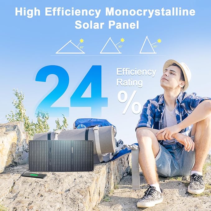 - 【High Conversion and Smart Protection】This portable solar panel can convert up to 24% of solar energy into free energy in enough sunlight, minimizing waste and maximizing output. The built-in smart chip will intelligently identify your device and ensures maximum charging speed while protecting your device from overcharging and overload.