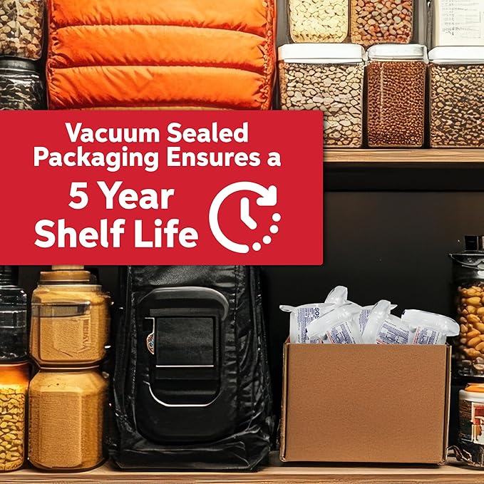 - 5-Year Shelf Life: Vacuum-sealed and designed to endure extreme conditions and temperatures, making it ideal for flood, hurricane, disaster preparedness.