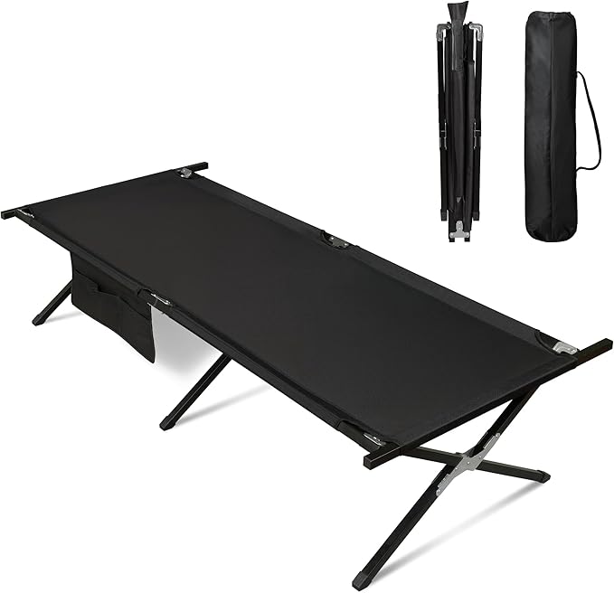 WLIVE Military Camping Cot, Portable Folding Cots for Sleeping with Carry Bag, Outdoor Camping Bed for Adults with Side Pocket, Support 300 Lbs, Black