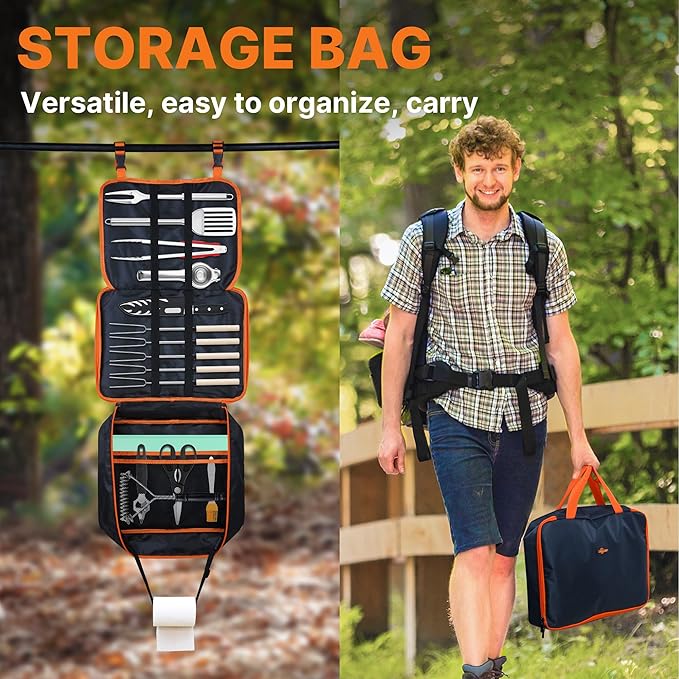 - 【Large Space Organizer Bag】This utensils set comes with a nice large space carrying bag made of Oxford Cloth. It is resistant to dust and water.It's portable, convenient, and large enough to store condiment bottles.You can use it to keep your own utensils, personalize you own cooking kit. A great gift for people who enjoy cookouts.