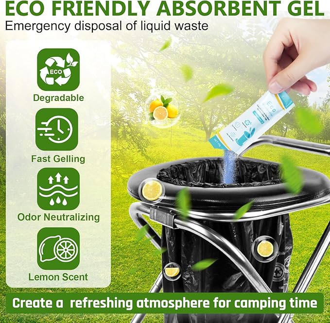 - 【Easy To Use & No Mess】BLIKA portable toilet kit is perfect to be accompanied with 8-gallon toilet bags with gel. Place the plastic ring on the seat, toilet bag will be held in place by a removable plastic ring. After using, rinse the seat with wipe paper as needed to keep clean. Portable toilet bag is made of plant starches and contain NO polyethylene. The toilet absorbent gel can quickly turns waste liquid into a solid gel that won't leak or splash out and gives off a light lemon scent.