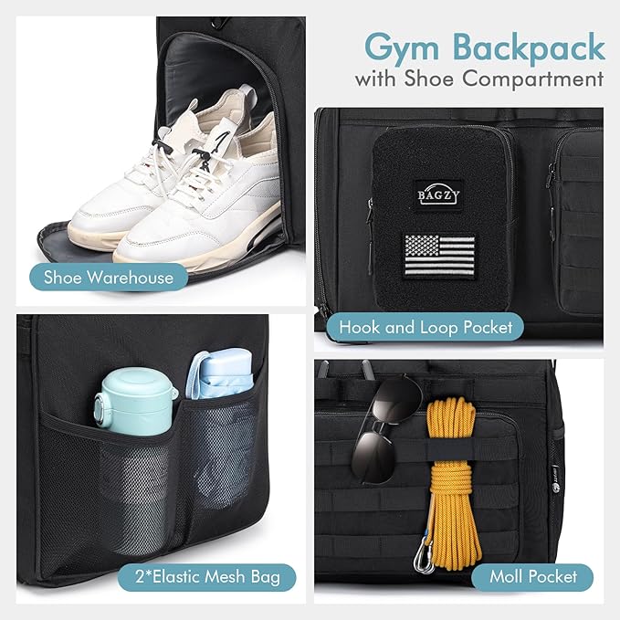 BAGZY Tactical Gym Bags for Men 3 In 1 Travel Duffle Bag 40L with Shoe Compartment Travel Backpack Fitness Weekender Deployment with 1pcs Tactical Toiletry Bag Black