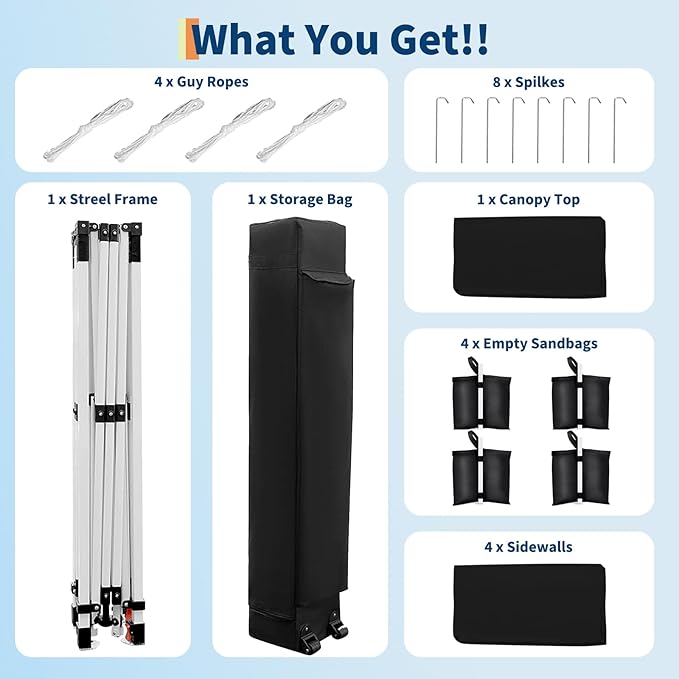 - EASY INSTALLATION: Designed with upgraded central lock system, simply press the central lock of the canopy tent to open or close it,and quickly complete the setup in a few seconds. no tools required.the canopy legs have 3 height adjustment holes to meet different occasions or needs.