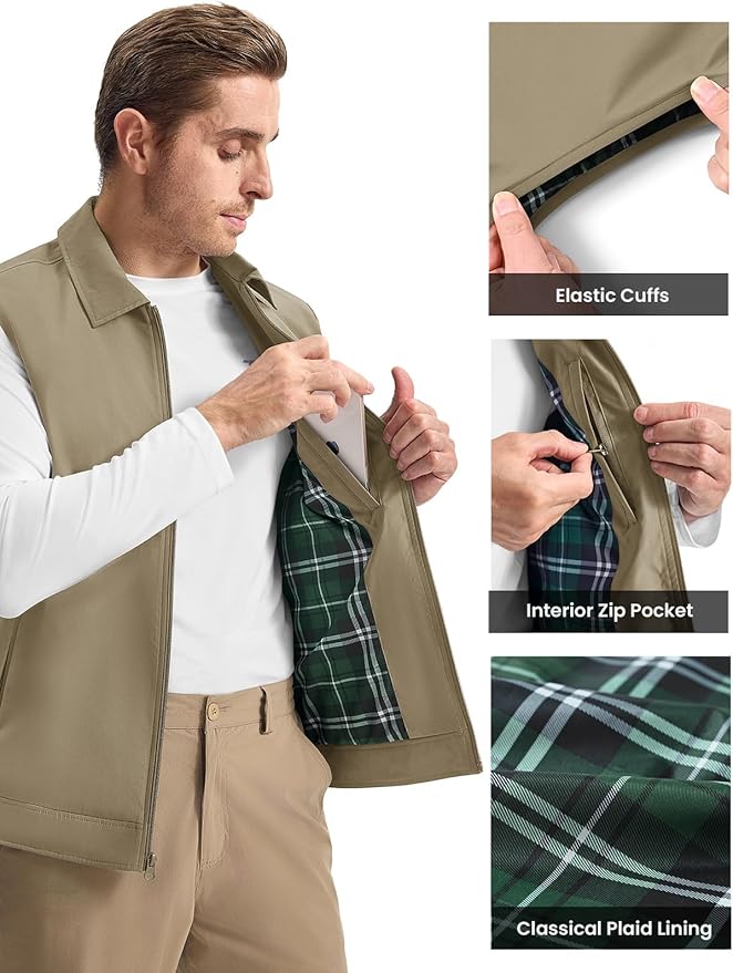 Rdruko Men's Golf Vest Lightweight Outerwear Windproof Water Resistant Grid Lining Vest with Zipper Pockets for Casual