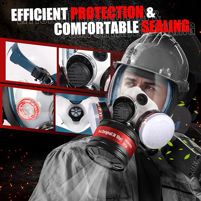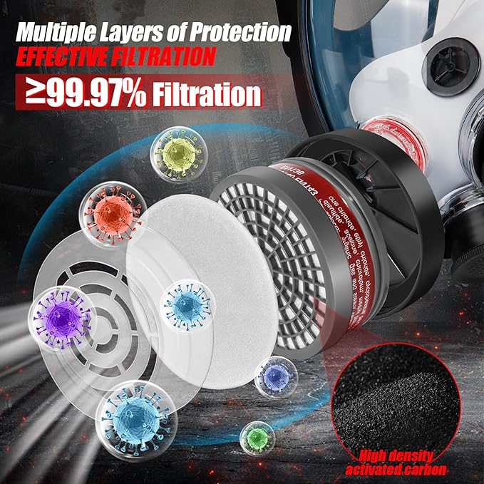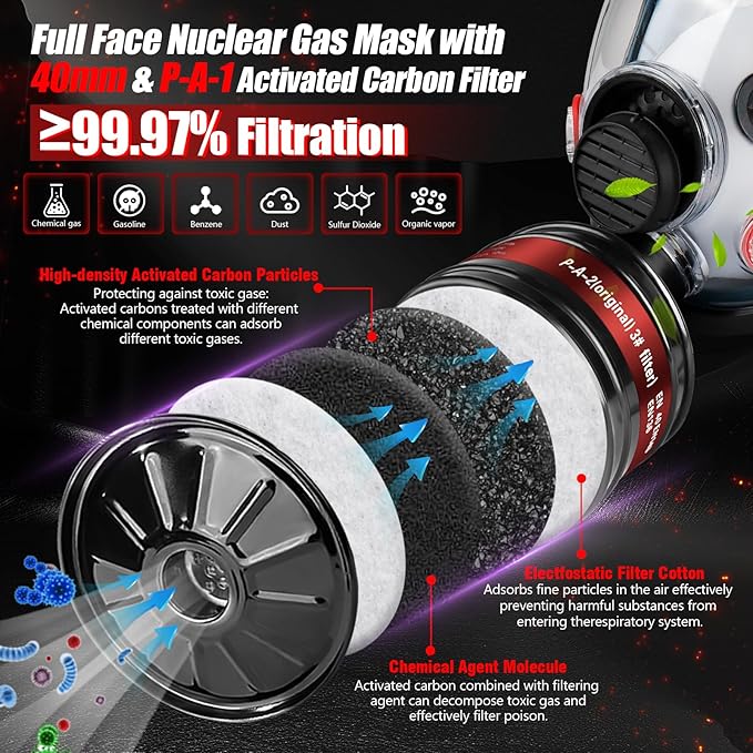 - 【Efficient activated carbon filter】: The gas masks is equipped with a 40mm activated carbon filter and a p-a-1 activated carbon filter. Effectively resist organic vapors, gases, chemicals, paint, fumes, dust, oily and non oily particles, etc。The filtration efficiency is as high as 99.97%.