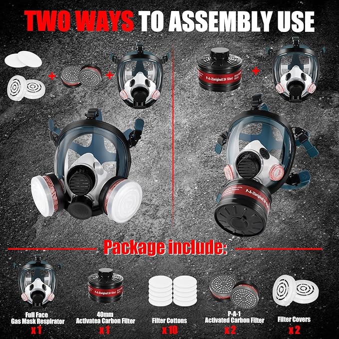 - 【Packaging includes】:1 full face gas mask, 1 40mm activated carbon filter, 2 P-A-1 cartridge filter , 4 filter cotton, 2 filter box covers