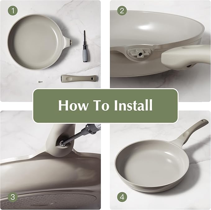 - Simple Packaging & Green Choice Our pans include: a non-stick pan, a handle, a screwdriver, a screw, and a gasket. Optimized packaging structure reduces volume by 30% and reduces transportation emissions