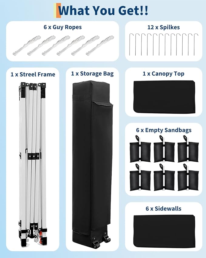 - EASY INSTALLATION: Designed with upgraded central lock system, simply press the central lock of the canopy tent to open or close it,and quickly complete the setup in a few seconds. no tools required.the canopy legs have 3 height adjustment holes to meet different occasions or needs.