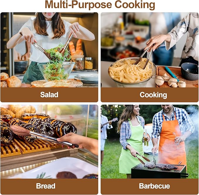 - Versatile Tongs for Cooking: The salad tongs come in an walnut wood color, our tongs for serving food come with stainless steel grip and wooden tips to protect the surfaces of your non-stick pans, Stainless Steel Grip is comfortable and effortless to clean,they're perfect as BBQ tongs for outdoor grilling or as salad tongs for indoor dining