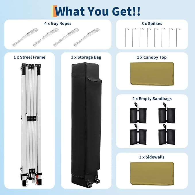 - VERSATILE USE: Our commercial pop-up canopy is suitable for picnics, camping, barbecues, sports, fishing, and other outdoor activities. It can also be used in yards, decks, farms, farmers' markets, beaches, and so on.