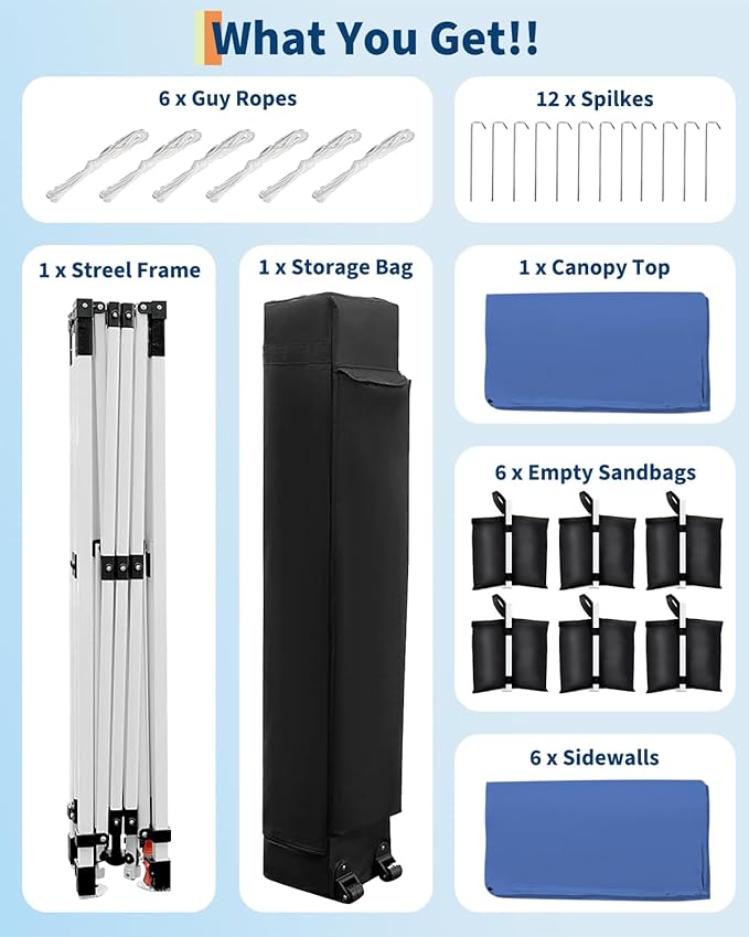 - VERSATILE USE: Our commercial pop-up canopy is suitable for picnics, camping, barbecues, sports, fishing, and other outdoor activities. It can also be used in yards, decks, farms, farmers' markets, beaches, and so on.