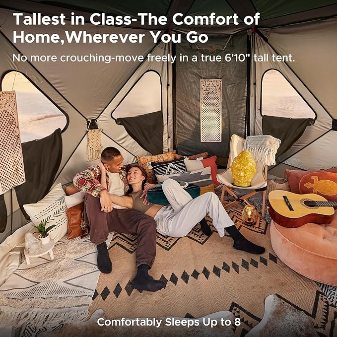- SPACIOUS INTERIOR FOR ULTIMATE COMFORT: With a generous interior that comfortably fits 4-8 people, this tents for camping is perfect for family getaways or group camping trips. Measuring 6'10" tall, it provides ample space to rest and easily store all your gear and luggage. Its roomy design ensures a comfortable camping experience wherever you go
