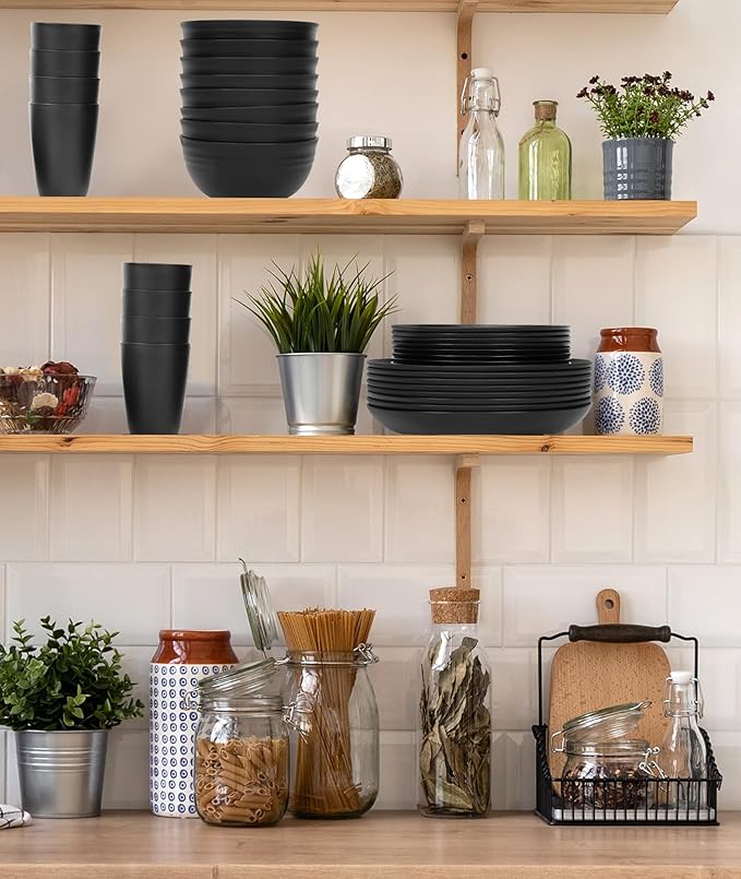 Quatish 32 Piece Plates and Bowls Sets for 8, Unbreakable Dinnerware Sets, Plastic Dish Set for Camping, Dishwasher Microwave Safe, Outdoor Kitchen and Apartment Dinning RV Essentials, Black
