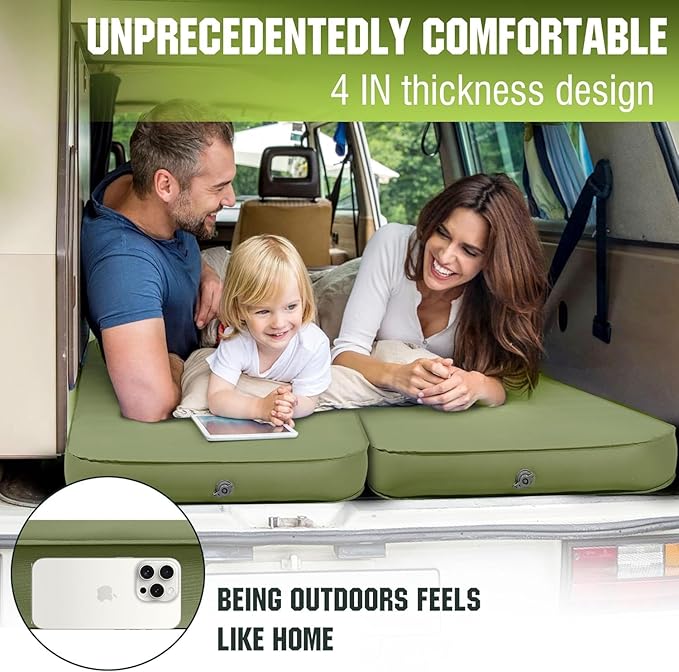 - Thick, Durable & Portable: Our air mattress for camping pad is measures 78” x 27” x 4” after inflation, much thicker and it can hold up to 350lbs. This 4” thickness sleeping mat will keep you away from the hard ground overnight. With a roll size of 12” x 12”, and Weighs only 7lbs, and comes with a shoulder storage bag, this sleeping pad is ideal for family camping, car camping, road trips, or for guests at home