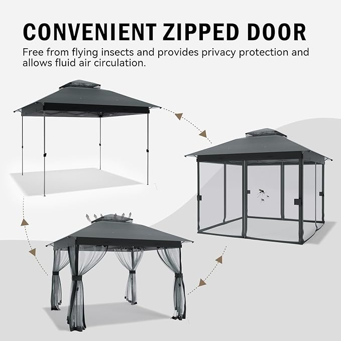 - 【BUG-FREE & BREATHABLE DESIGN】Double-tiered roof design + Zip-Up Mesh Sidewalls. Removable zippered breathable mesh curtains keep bugs out while letting breezes flow through. No Stuffiness, Just Shade!