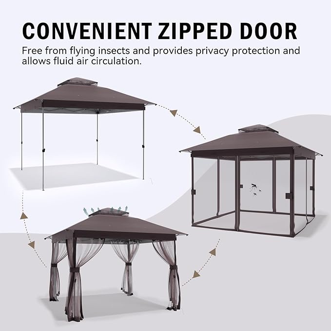 - 【BUG-FREE & BREATHABLE DESIGN】Double-tiered roof design + Zip-Up Mesh Sidewalls. Removable zippered breathable mesh curtains keep bugs out while letting breezes flow through. No Stuffiness, Just Shade!