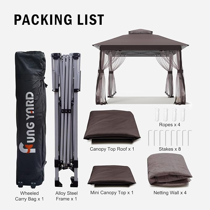 - 【WARM TIPS】Always anchor your patio canopy with stakes to prevent tipping in wind. For safety, remove the CANOPY TOP during Rainy Day or Long Storage to extend its lifespan. Regular maintenance ensures years of reliable shade and comfort.