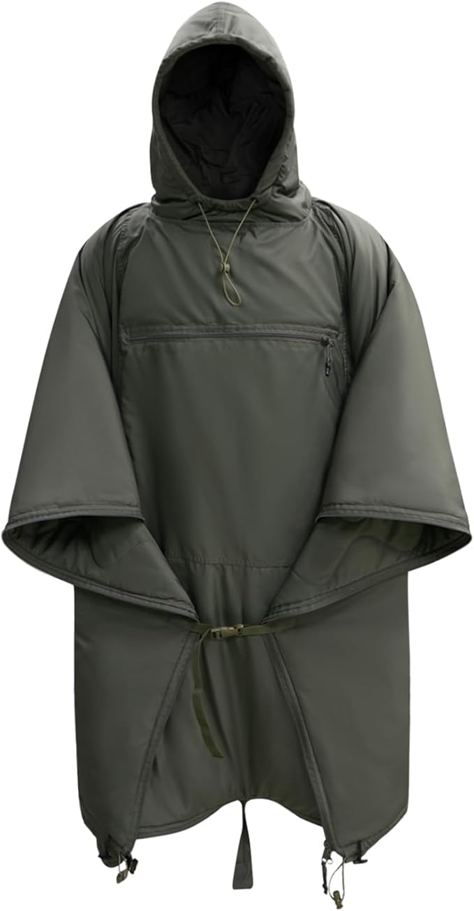 - Windproof Design: The camping insulation poncho with containable warm hood, collar windproof tightening rope and side fixed latch and hem windproof tightening rope eliminate cold air gaps, front zippered pocket (fits phones/keys) with hanging loop for quick access.
