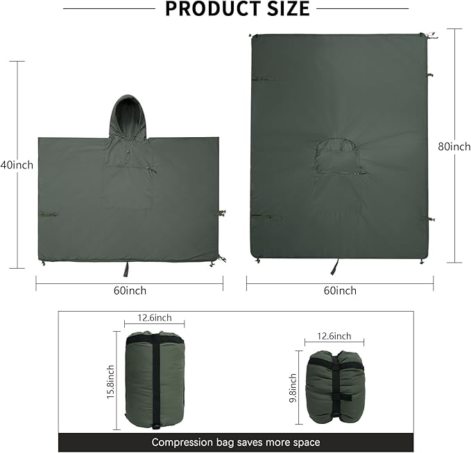 - Package: The multipurpose insulation poncho is integral self-pack pocket and be fully compressed into its compression sack for easy carry and storage in camping, backpack, car emergency kit, or hiking gear, reduces space and volume.