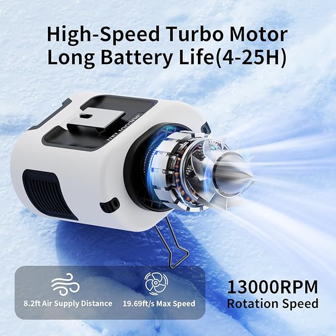 - 【Shirt Fan Clip with Silicone Cover, Anti-Drop】A practical design with two Manganese steel clamps facing opposite directions allows for more placement options. Clip a long clamp onto a belt and blow air under the shirt, as well as a short clip to prevent your shirt from blocking the intake. The body fan comes with a high-quality protective silicone leather case, which protects from shock when dropped and ensures the body fan is not damaged. It is designed for various outdoor usage scenarios, catering to occupations like workers and farmers