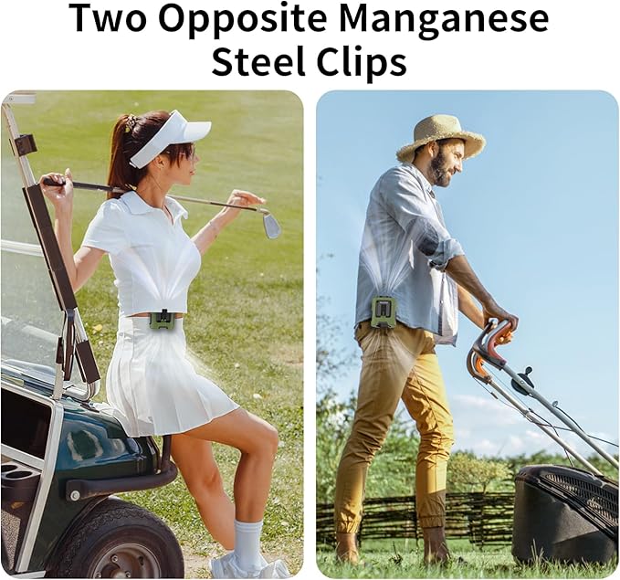 - 【Shirt Fan Clip with Silicone Cover, Anti-Drop】A practical design with two Manganese steel clamps facing opposite directions allows for more placement options. Clip a long clamp onto a belt and blow air under the shirt, as well as a short clip to prevent your shirt from blocking the intake. The body fan comes with a high-quality protective silicone leather case, which protects from shock when dropped and ensures the body fan is not damaged. It is designed for various outdoor usage scenarios, catering to occupations like workers and farmers