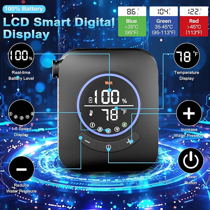 - 【Advanced Smart LED Display】 Our portable camping shower features an upgraded LED display that allows you to clearly monitor the battery level and water temperature in real time. From 50–122°F, you’ll be sure to avoid heat burns and power outages while enjoying your outdoor adventure. Whether you're hiking or relaxing at the beach, this portable shower delivers the latest information with smart technology to enhance your camping experience.