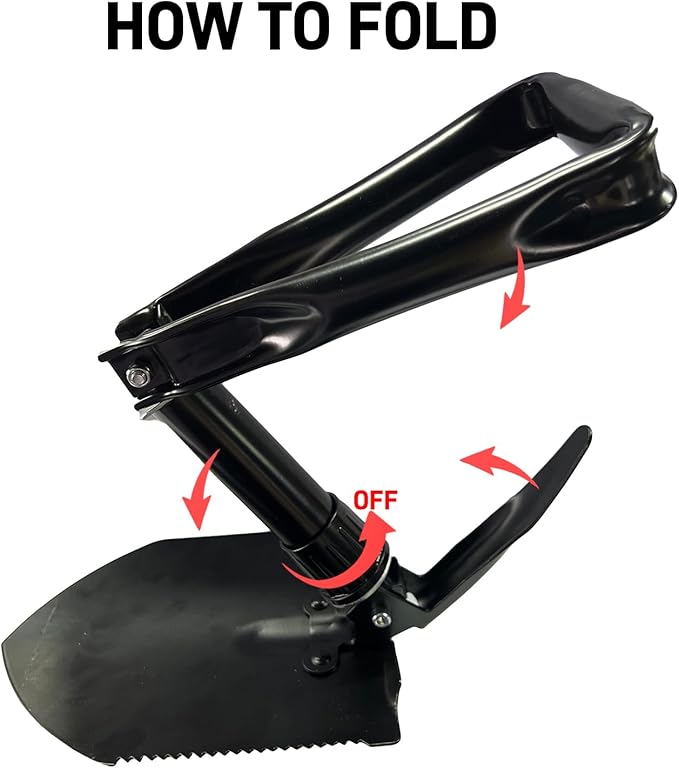 - 3-IN-1 MULTIPURPOSE: Features a versatile design with a 180-degree shovel, 90-degree pickaxe, and 90-degree pick hoe. The tactical military shovel is a rugged tool for digging, shoveling, sawing, chopping, and entrenching. Whether you are backpacking on a wilderness adventure or preparing for an emergency, this emergency shovel is a vital necessity in the great outdoors.
