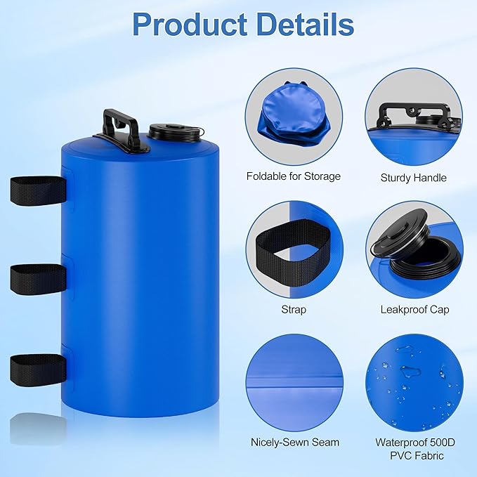- Sturdy Leak Proof: Made from sturdy 500D PVC material, these canopy water weights are guaranteed to be leak-proof and tear-resistant, ensuring your tent or canopy stays strong in strong winds, Comes with 4 O-ring waterproof gaskets to prevent leaks and quick replacement