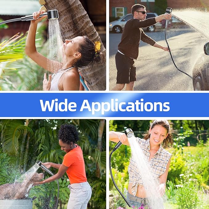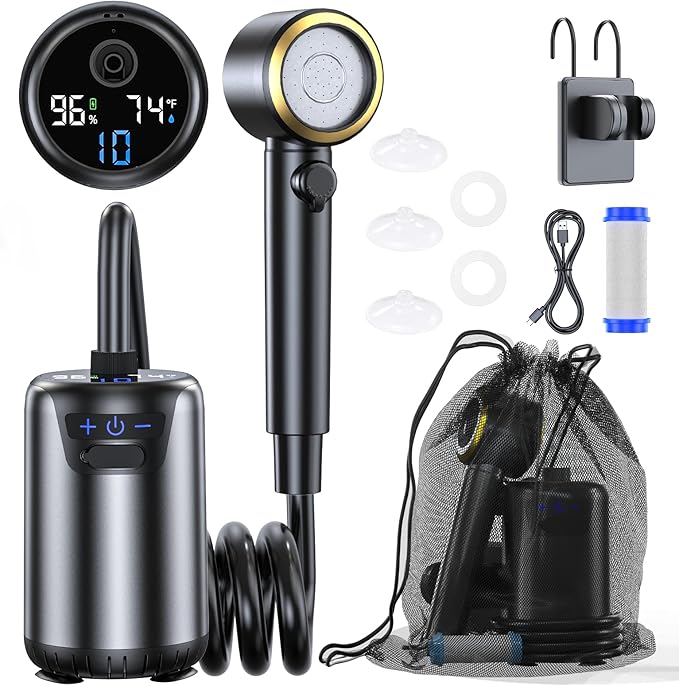 - Compact and Portable: Portable shower kit weights only 2.3LB, includes 1* Multi modes shower head, 1* Spray gun head, 1* Power water pump, 1* 6.7ft Water pipe, 1* Multi-use hook, 1* Type-C charging cable, and a Mesh organizer bag for convenient to carry and store. Ideal for indoor/outdoor showers, camping, BBQ, hiking, beach, trips, bathing, pet bath, car washing, plant watering and more indoor outdoor use